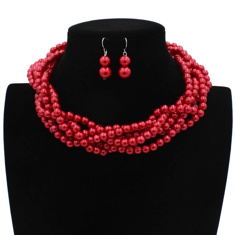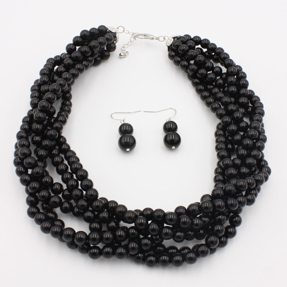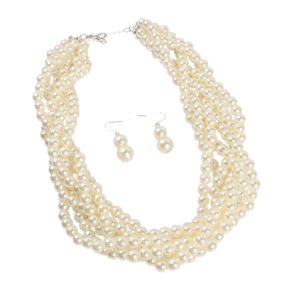 Multilayer Imitation Pearl Earhook Beaded Necklace Short Jewelry Set